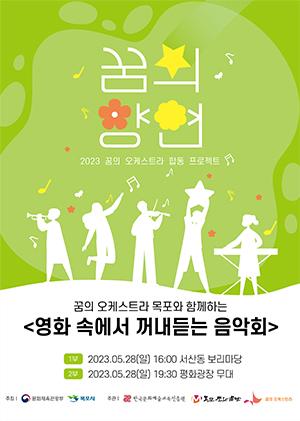 꿈의 오케스트라 목포가 펼칠 ‘영화 속에서 꺼내 듣는 음악회’ 공연은 서산동 보리마당에서 오후 4시에 1부가 진행되며 2부는 평화광장 무대에서 오후 7시 30분에 진행된다.