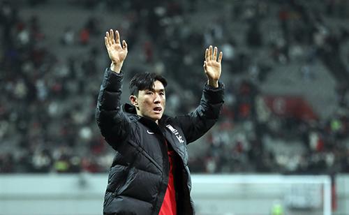 대한민국 황인범이 28일 오후 서울 마포구 서울월드컵경기장에서 열린 하나은행 초청 축구 국가대표 평가전 대한민국과 우루과이의 경기에서 2대1로 패한 뒤 팬들에게 인사하고 있다. 2023.03.28.