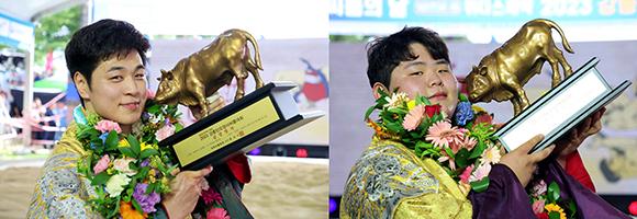 영암군민속씨름단의 최정만 금강장사(왼쪽)와 김민재 백두장사.