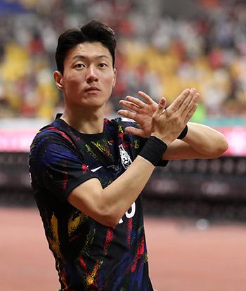 지난 16일 오후 부산 연제구 부산아시아드주경기장에서 열린 하나은행 초청 축구 국가대표 평가전 대한민국과 페루의 경기를 마친 뒤 황의조가 팬들에게 인사하고 있다. 2023.06.16.