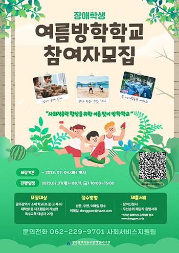 여름방학학교 운영 기간 및 시간은 7월 31일부터 8월 11일까지 오전 10시부터 오후 3시까지이다. 기타 자세한 사항은 동구장애인복지관 누리집(www.dongguwc.or.kr) 또는 사회서비스지원팀으로 전화(062-229-9701) 문의.