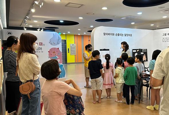 광양희망도서관에서 7월 한 달간 매주 토요일마다 열리는「김준영 작가의 방, 그럴 때는 그림책」전시 도슨트 프로그램에 관람객들의 호응이 높다.