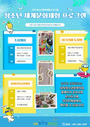 담양군 담빛청소년문화의집은 여름방학을 맞이하여 청소년들을 위한 세계 각국의 문화를 체험할 수 있는 ‘청소년 세계문화체험 프로그램’을 운영한다고 16일 밝혔다.