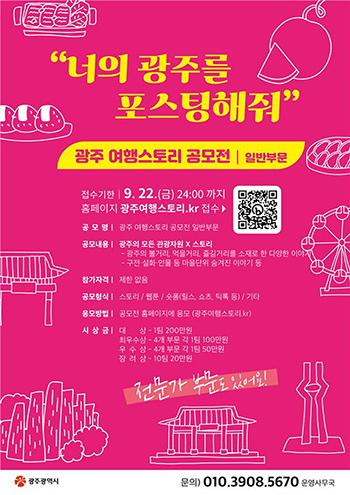 이번 공모는 무등산, 망월동, 영산강, 국립아시아문화전당, 양림동 등 광주를 대표하는 장소는 물론 다양한 소재를 나만의 이야기로 풀어낸 ‘너의 광주를 포스팅해줘’라는 주제로 진행된다.