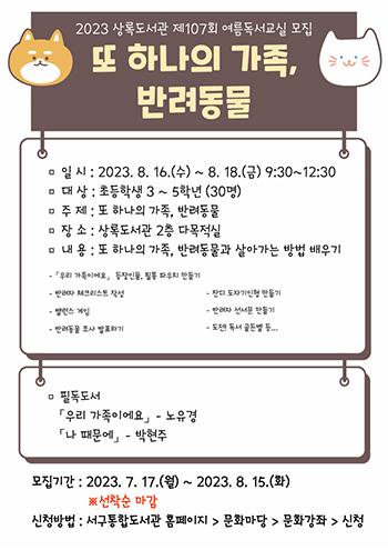 상록도서관에서는 8월 16일부터 18일까지 3일간 초등학생 3~5학년 20명과 ‘또 하나의 가족, 반려동물’이라는 주제로 반려동물과 더불어 살아가는 방법을 알아보고 반려자로서 책임감을 기를 수 있는 시간을 가진다. 또한 반려동물에 대한 올바른 가치관 함양을 목표로 관련 도서를 읽고 피라미드 토론, 잔디 인형 만들기, 독서 골든벨 등 다양한 독후활동을 펼칠 예정이다.