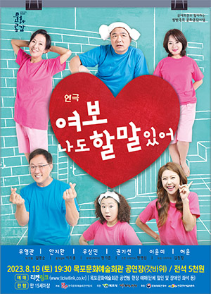 목포시가 오는 8월 19일 오후 7시 30분 목포문화예술회관 공연장에서 시민들의 문화예술 향수권 신장을 위해 연극 『여보 나도 할 말 있어』공연을 선보인다.