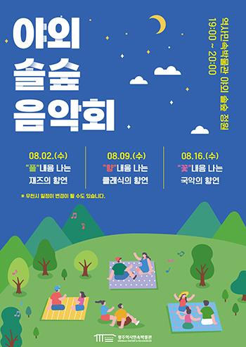 먼저 ‘솔숲음악회’가 역사민속박물관 야외광장에서 총 3차례 무료로 진행된다. 공연 시간은 8월 2일, 9일, 16일 저녁 7시부터 8시까지다. 이번 공연은 한여름 밤의 시원한 낭만을 즐기기 위해 솔숲에 무대와 관람석을 마련해 ‘캠핑’을 주제로 재즈, 팝페라, 퓨전국악 등 다양한 장르의 음악을 선보인다.