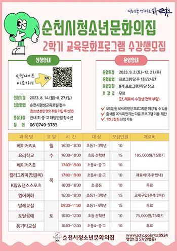 순천시는 오는 9월 2일부터 12월 21일까지 4개월 동안 주 1회 2시간씩 청소년문화의집 2학기 교육문화프로그램을 운영할 계획이라고 밝혔다.