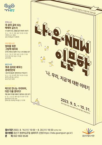 광주 광산구가 인문도시기반구축지원사업에 따라 9~10월 4개 구립도서관에서 운영하는 ‘나·우·NOW 인문학’의 참여자를 모집한다.