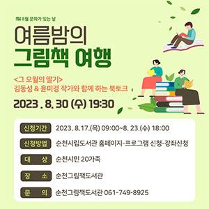 ‘여름밤의 그림책 여행’프로그램은 20가족을 대상으로 하며, 관심 있는 시민은 17일부터 순천시립도서관 누리집에서 신청할 수 있다.