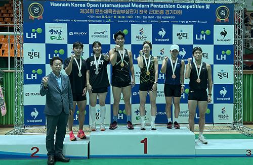 전남도청 근대5종팀 박상구와 김선진이 전국대회 혼성계주 정상을 차지하며 금메달을 목에 걸었다.