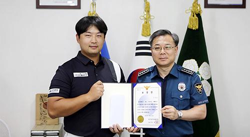 이하늘(왼쪽)이 21일 경기 용인 동부경찰서로부터 표창장을 수여받았다.(사진=KPGA 제공)