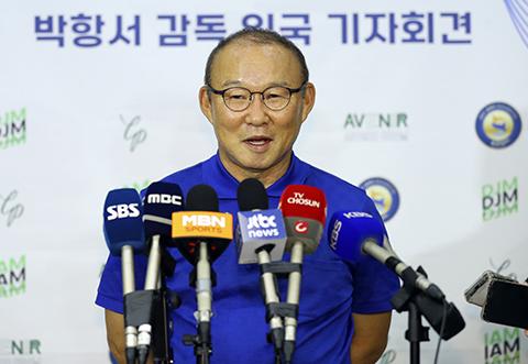 박항서 전 베트남 축구 대표팀 감독이 14일 인천 국제공항을 통해 귀국해 기자회견을 하고 있다. 베트남 축구대표팀과 5년 동행을 마친 박 감독은 이날 귀국 방송 촬영 등의 일정을 소화한 뒤 16일 다시 베트남으로 출국할 예정이다. 2023.02.14