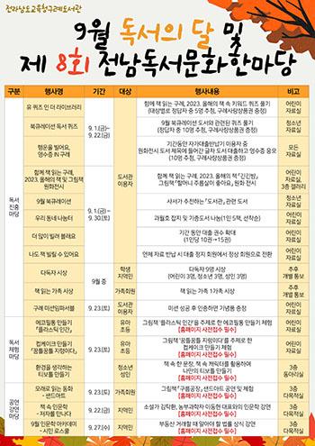 올해 독서의 달은 ‘펼쳐보자 책도, 꿈도’라는 슬로건 아래 전국 도서관에서 9월 1일부터 9월 30일까지 진행되며, 전라남도교육청구례도서관은 이 기간동안 제8회 전남독서문화한마당을 비롯한 다양한 독서문화 행사들을 제공할 예정이다.