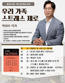 특강을 진행할 박정우 작가는 현재 한국스트레스교육협회 협회장이자 마스터컨설팅 대표로서 ‘온 스트레스’, ‘스트레스 뉴노멀’, ‘어바웃 번아웃’ 등 다수의 저서를 저술했으며 각종 공공기관과 기업 등에서 활발한 강연 활동을 펼치고 있다.