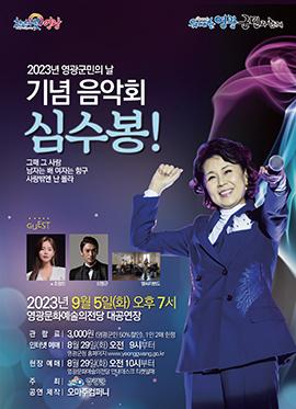 1978년 데뷔 이래 음악에 대한 끊임없는 열정과 심오한 서정성을 바탕으로 세월이 가도 변치 않는 자태와 목소리로 한결같이 대중의 사랑을 받고 있는 대한민국 최고의 싱어송라이터, 명실상부한 트로트의 거장 아티스트 심수봉이 영광군민을 위한 특별한 공연을 준비한다. 이번 무대에서 심수봉은‘남자는 배 여자는 항구’,‘사랑밖에 난 몰라’,‘백만송이 장미’등 지금까지 꾸준한 사랑을 받아온 히트곡을 선보일 예정이다.