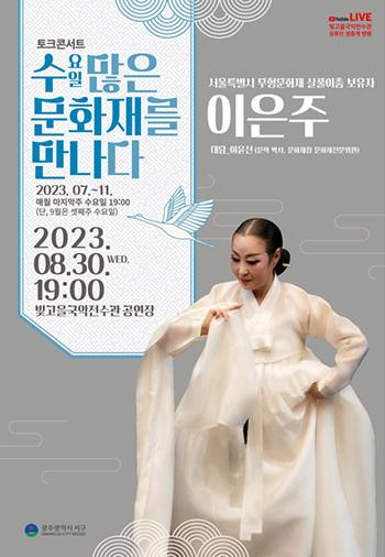 이윤선(문학박사, 문화재청 문화재전문위원)의 대담으로 진행되는 이번 토크콘서트에서는 이은주 명인의 가족에 관한 이야기, 살풀이 춤사위와 춤의 정신, 초보자들도 쉽게 배우는 춤의 방법, 그 외 다양한 전통춤 등에 대해 자세히 들어 볼 수 있다.