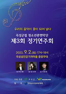 곡성군미래교육재단이 오는 9월 2일 오후 5시에 섬진강기차마을 중앙무대에서「곡성군립 청소년관현악단 제3회 정기연주회」를 개최한다.