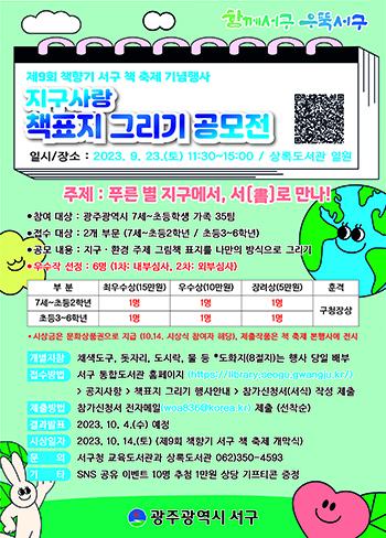광주시 서구가 오는 9월 22일까지 ‘지구사랑 책표지 그리기 공모전’ 참가를 희망하는 가족 35팀을 선착순 모집한다.