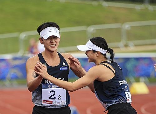 한국 남녀 근대5종 간판 전웅태(광주시청)와 김선우(경기도청)가 세계선수권대회에서 혼성계주 은메달을 목에 걸었다.