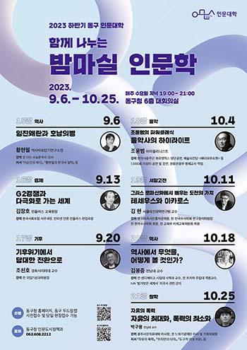 광주 동구가 ‘함께 나누는 밤마실 인문학’ 동구 인문대학 하반기 강좌를 개강한다.