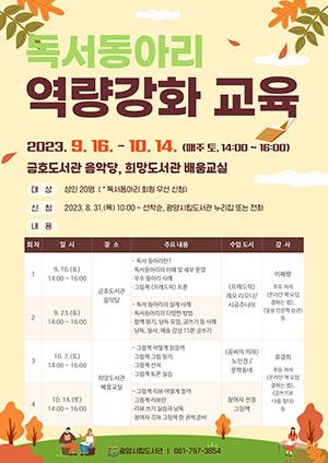 광양시는 도서관을 기반으로 하는 독서동아리의 자립성 향상과 지역사회 책 읽는 분위기 조성을 위한 ‘2023년 독서동아리 역량 강화 교육’을 운영한다.