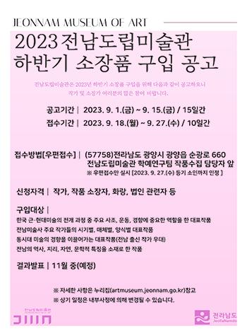전남도립미술관은 미술관의 정체성에 부합하고 미술사적·예술적으로 가치가 높은 작품을 수집하기 위해 2023 하반기 소장작품 구입 공모를 오는 18일 시작한다고 밝혔다.
