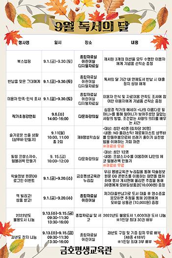 9월 독서의 달 행사 및 독서 프로그램에 대한 정보는 금호평생교육관 홈페이지(http://lib.gen.go.kr/geumho) 에 게시돼 있으며, 행사 관련 문의는 종합자료실 062-360-6682, 독서 프로그램에 관한 문의는 어린이실 062-360-6676로 하면 된다.