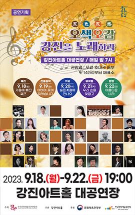 강진군은 ‘오색오감-강진을 노래하라’ 공연을 오는 18일부터 22일까지 5일간 매일 오후 7시 강진아트홀 대공연장에서 무료로 진행한다고 12일 밝혔다.
