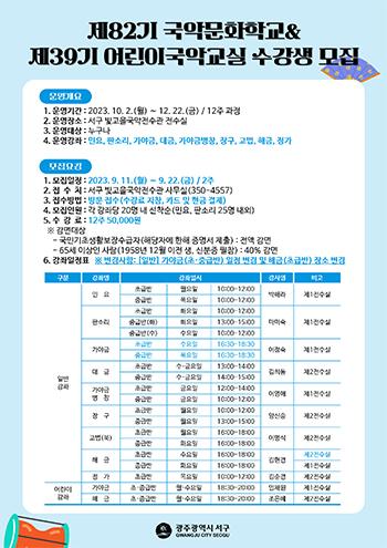 광주시 서구는 지역 주민과 어린이들을 대상으로 빛고을국악전수관에서 진행되는 ‘제82기 국악문화학교&제39기 어린이국악교실’ 수강생을 오는 22일까지 모집한다.