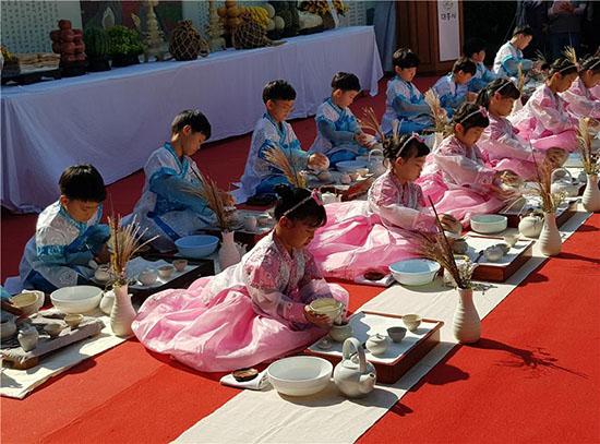 일지암 유천수 전달식에 이어서 한듬어린이집 원생 20여명의 원아들이 고사리 손으로 차를 내리는 시연이 관람객들의 눈길을 사로잡는다.