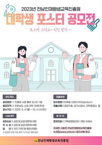 전남인재평생교육진흥원이 도내 대학생의 참신한 아이디어를 발굴해 사업 홍보 포스터 디자인에 활용하기 위해 \'2023년 대학생 포스터 공모전\'을 개최한다.