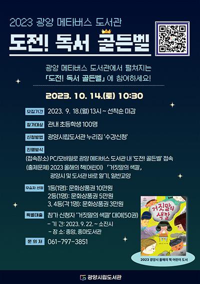 ‘도전! 독서 골든벨’은 독후 활동과 재미를 결합한 특별한 이벤트로, 독서를 즐기고 지식을 향상시키며 메타버스의 매력을 체험할 수 있다. 이번 독서 골든벨 선정 도서는 2023 광양시 올해의 책 어린이 부문에 선정된 김화요 작가의 \'거짓말의 색깔\'이다.
