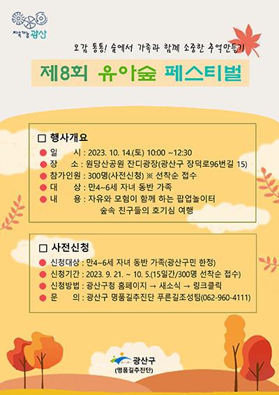 광주 광산구가 10월 14일 수완동 원당산공원에서 ‘제8회 유아 숲 페스티벌’을 개최한다고 밝혔다.