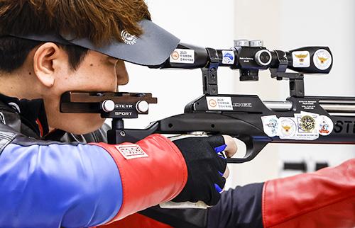 정유진이 26일 중국 항저우 푸양 인후 스포츠센터에서 열린 2022 항저우 아시안게임 남자 10m 러닝타깃 혼합 개인 및 단체전에서 사격을 하고 있다. 2023.09.26.