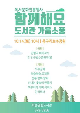 화순군은 오는 14일 동구리 호수공원에서 화순열린도서관 독서문화진흥행사 “함께해요! 도서관 가을소풍”을 개최한다고 밝혔다.