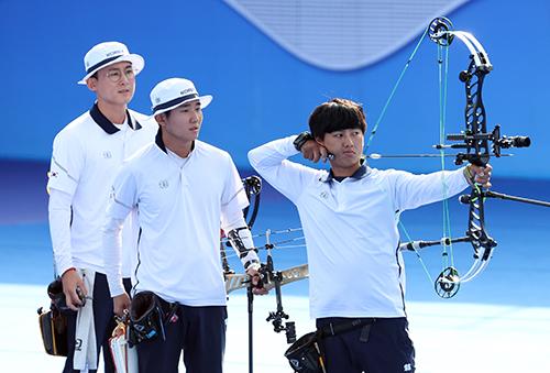 주재훈(한국수력원자력), 양재원(상무), 김종호(현대제철)로 구성된 한국은 5일 중국 항저우의 푸양 인후 스포츠센터에서 열린 양궁 컴파운드 남자 단체전 결승에서 인도에 235-230으로 졌다.