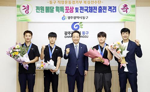 임택 동구청장이 ‘제104회 전국체육대회’ 출전을 앞두고 막바지 구슬땀을 흘리고 있는 동구복싱단을 격려하고, 올해 출전 대회에서 거둔 메달 획득에 대한 포상과 함께 전국체육대회 우승을 기원했다.
