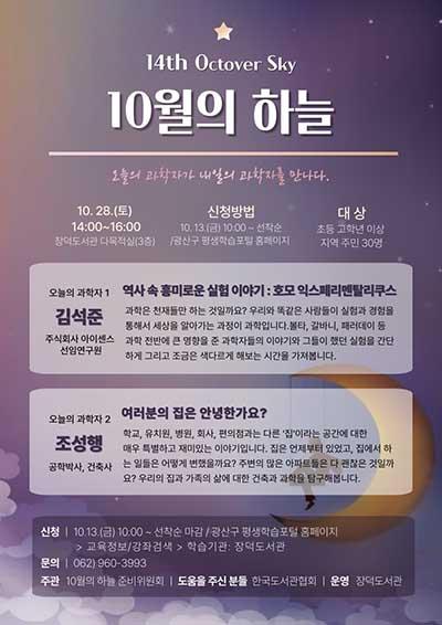 광주 광산구 장덕도서관은 과학자들의 재능기부 과학 강연인 ‘10월의 하늘(October Sky)’을 28일 개최한다고 밝혔다.