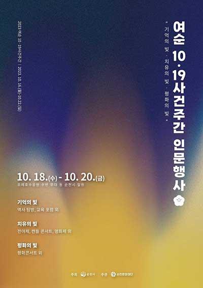 순천시 관계자는 “여순 10·19사건주간 인문행사를 위해 문화와 예술의 향연의 장을 마련한 만큼 유가족의 아픈 상처가 치유되고 지역민이 위로를 건네는 자리가 되길 바란다”라고 전했다.