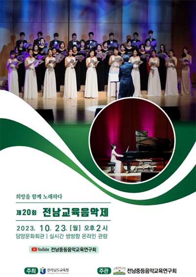 전남중등음악교육연구회는 오는 10월 23일 월요일 오후 2시, 담양문화회관 대공연장에서 ‘희망을 함께 노래하다’를 주제로 ‘제20회 전남교육음악제’를 개최한다고 밝혔다.