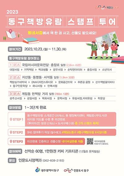 참여 방법은 시민, 관광객 누구나 ‘동구 책방 유람’에 소개된 20곳 중 2곳을 방문해 스탬프를 받고 도서 1권을 구매한 후 이를 SNS에 게시하고 네이버 폼(naver.me/57rN108t)에서 설문 작성 후 제출하면 된다.