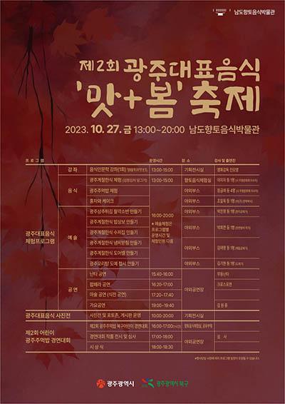 축제에서는 광주를 대표하는 음식을 소재로 다양한 체험과 경연의 장을 마련, 광주의 맛을 공유하고 주민들이 어우러질 수 있는 공연도 선보인다. 지역 음식 문화 체험의 중심지인 남도향토음식박물관을 널리 알리고자 기획, 추진됐다.