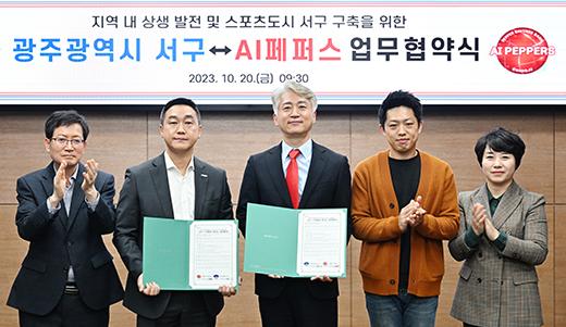 광주시 서구와 AI페퍼스 여자프로배구단이 ‘스포츠도시 서구’ 실현을 위해 손을 맞잡았다. 김이강 서구청장과 김동언 AI페퍼스 배구단장은 20일 오전 서구청 나눔홀에서 상생발전을 위한 업무협약을 체결했다.