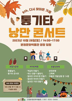 분청문화박물관(이하 박물관) 광장 일원에서 열리는 이번 행사는 ‘여섯 번째 가을, 통기타 낭만콘서트’ 라는 주제로 ▲박물관 무료 관람 ▲통기타 낭만콘서트 ▲책갈피 만들기 ▲독도 만들기 활동지 ▲할로윈 호박 조명 만들기 ▲할로윈 머리띠 만들기 ▲할로윈 가면 만들기 ▲분청사기 깜짝 할인판매 ▲관람객 참여 이벤트 등 다양한 프로그램으로 진행된다.
