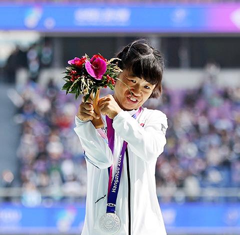전민재가 23일 중국 항저우 올림픽 스포츠센터 주경기장에서 열린 2022 항저우 장애인아시안게임 육상 여자 T36 200m에서 은메달을 목에 걸었다. (사진 = 대한장애인체육회 제공