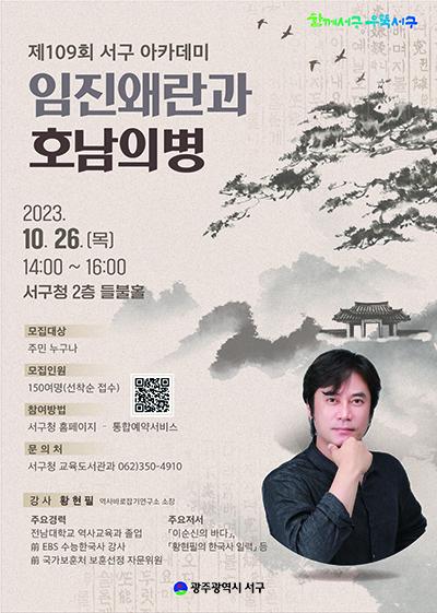 광주시 서구는 오는 26일 오후 2시 황현필 역사바로잡기연구소 소장을 초청해 ‘임진왜란과 호남의병’이라는 주제로 제109회 서구 아카데미를 서구청 들불홀에서 개최한다.
