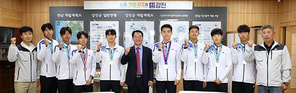 강진원 강진군수가 지난 20일 군수실을 방문한 강진군청 사이클선수단을 격려했다.