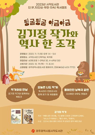 광주시립사직도서관은 김기정 작가와 함께하는 ‘단무지(단순·무한·지속) 독서캠프’를 오는 11월 11일 도서관 다목적실과 북카페에서 연다.