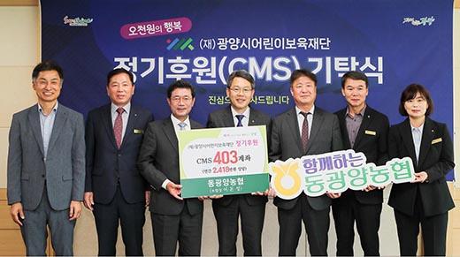 동광양농협은 (재)광양시어린이보육재단에 정기후원 CMS 403계좌(연간 2418만원 상당)의 기부금을 전달했다.